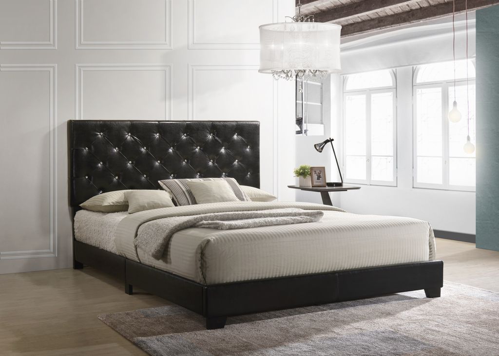 Description: Upholstery Bed including 4 slats. Complete BED-IN-A-BOX, Features - Diamond Tufted Headboard
