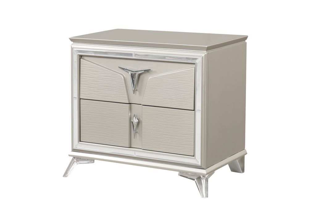 Platform bed with 2 storage drawers located in the footboard. LED Lighting on headboard. Features acrylic legs & accent handles.