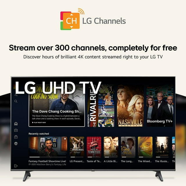 Dive into a world of free content and personalized recommendations for everyone you share the remote with. Enhance your picture and sound with AI from the α5 Gen5 AI Processor 4K that is engineered to amaze by transforming your regular content into 4K for sharper definition and detail, even on our biggest screens*. Take binge-watching further by customizing your viewing experience with separate accounts and personalized recommendations for every member of your family with webOS 22. And enjoy binge-worthy streaming with built-in access to Netflix, the Apple TV app, Disney+, HBO Max** and to over 300+ free LG Channels*** with everything from comedy to movies to sports. For gamers, you can make it the best gaming experience by quickly adjusting all your game settings in one location with the LG Game Optimizer and Dashboard. Bring your content to life with LG UHD. See a vivid picture every time with LG UHD’s 4K resolution. *Image quality of upscaled content will vary based on the source resolution. **Internet connection and subscriptions to streaming services are required. HBO Max™ ©2022 Warner Media, LLC. All Rights Reserved. HBO Max is used under license. ***Number of LG Channels subject to change.