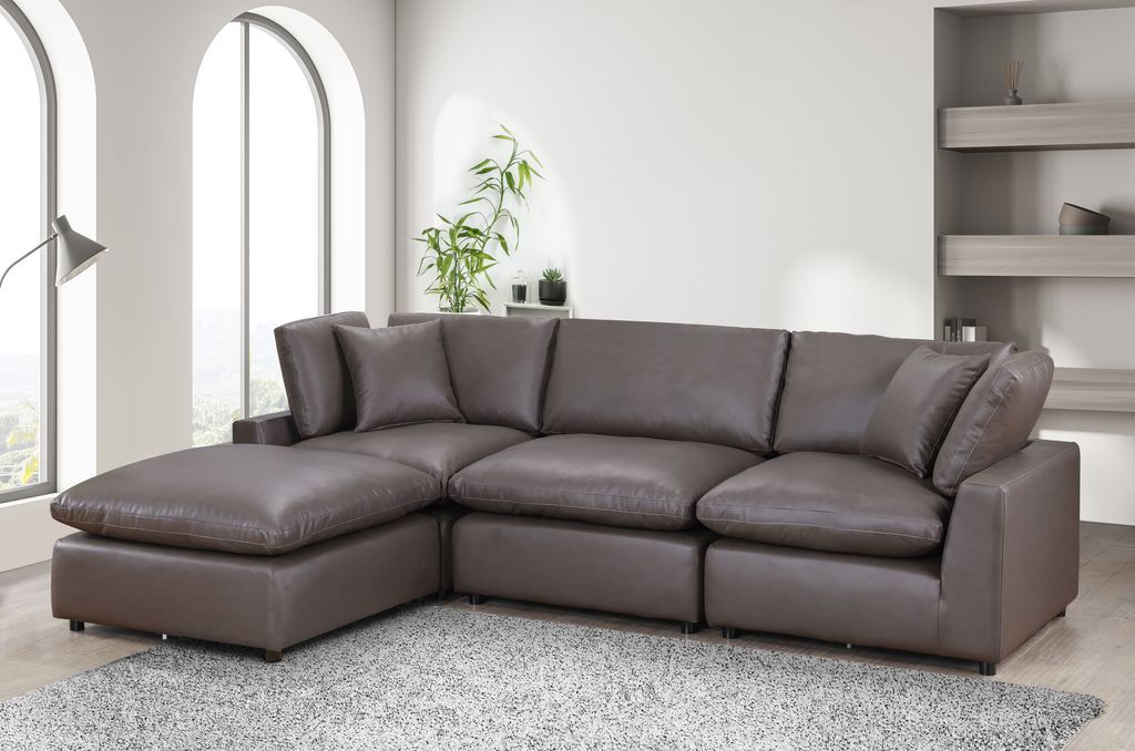 This modern sectional sofa features a sturdy solid wood frame and plush cotton and down cushions for an indulgent, sink-in experience. SKY is adorned with generously padded down feather and cotton cushions, along with cushioned foam bases, making it an ideal addition to the living room, family room, or game room. Crafted for both sprawling lounging and cozy curling up, SKY invites you and your guests to settle in and enjoy the moment. Equipped with plastic foot glides, the corner piece includes two back pillows and a throw pillow. Each seat has a weight capacity of 331 lbs.